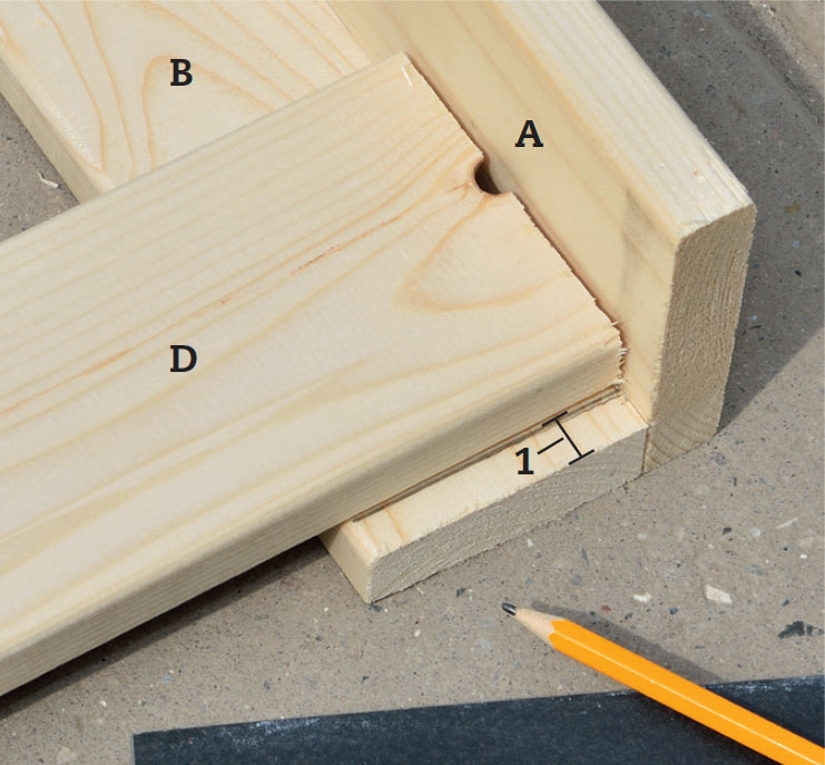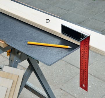Merkitse pitkien sivujen (D) paikka jalkojen (B) sisäpintaan niin, että sivun yläreuna jää laatan paksuuden verran jalan yläreunasta. Tässä mitta on 10 mm, ja se sahataan sivujen leveydestä. Tee merkinnät sivujen molempiin reunoihin.