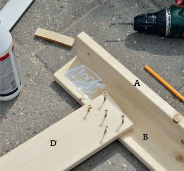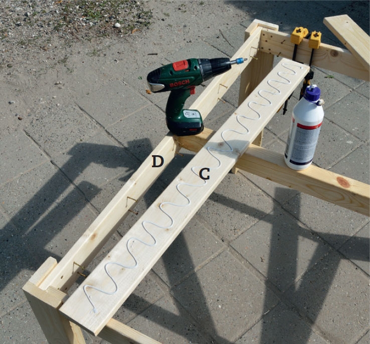 Valmistaudu yhdistämään pitkät sivut (D) jalkoihin. Kiinnitä sivuihin viisi 4 x 35 mm:n ruuvia esiporattuasi niille ensin reiät 3 mm:n poralla. Sivele jalkojen liitospintaan ulkokäyttöön tarkoitettua puusepänliimaa.