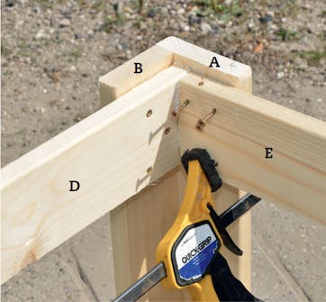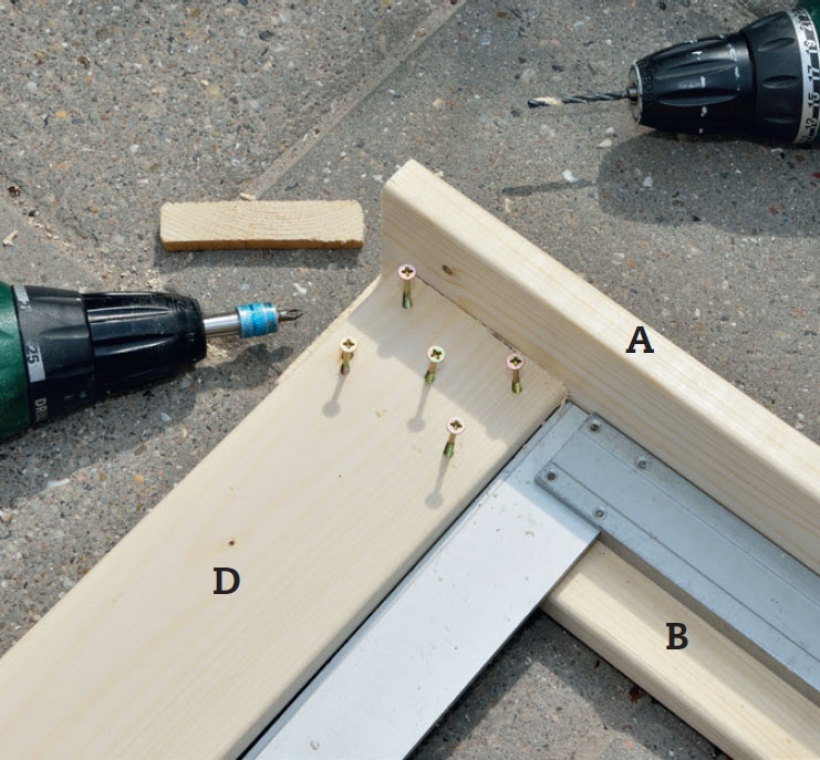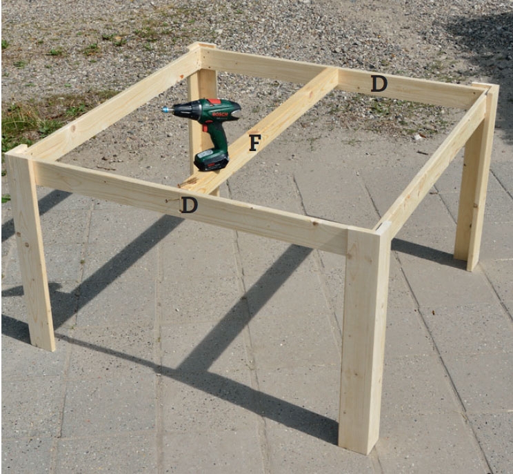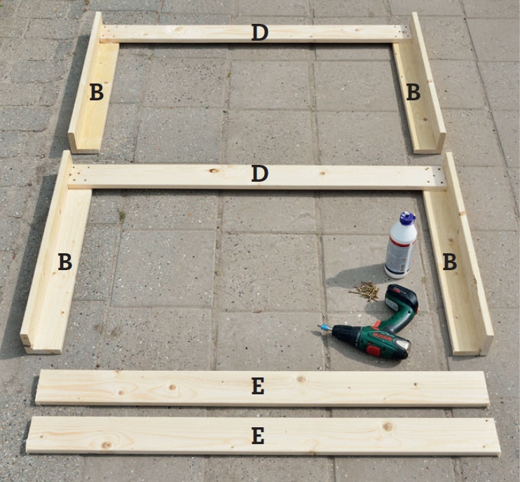 Kiinnitä toinen lyhyt sivu (E) jalkoihin (A) 4 x 35 mm:n ruuveilla ja liimalla. Tue se pitkiä sivuja (D) vasten ja sijoita yhtä etäälle jalkojen yläreunasta kuin äskenkin. Muista jälleen asettaa osat tarkasti suoraan kulmaan.