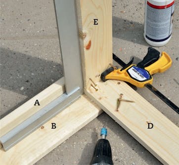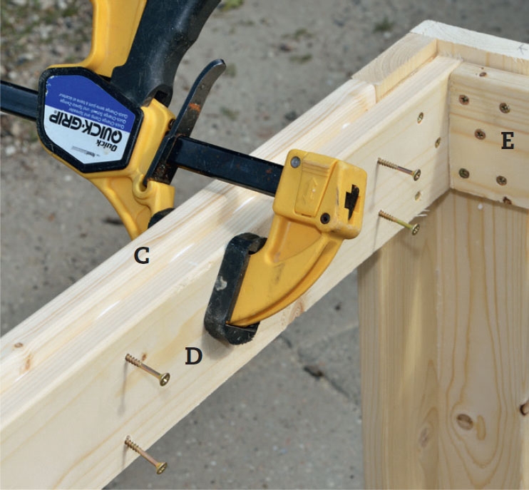Valmistaudu ruuvaamaan ja lii maamaan. Esiporaa ruuveille reiät sivui hin (D ja E) ja sivele liimaa peitelau doille (C). Käy tä jälleen 4 x 35 mm:n ruuveja. Ne pitä vät osat yhdessä liiman kuivumis ajan, jonka jälkeen liima jo pitää osat yhdessä.