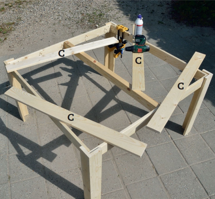 Sahaa neljä peitelautaa (C) pituuteen niin, että ne sopivat tarkasti jalkojen väliin. Pituuksissa voi ilmetä pieniä eroja runkoa koottaessa, joten on parempi mitata jokainen lauta yksitellen.