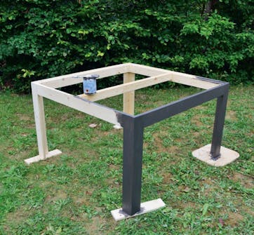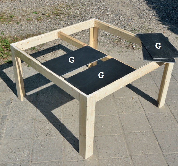 Kun neljä jalkaa ovat valmiit, ne yhdiste-tään neljällä vaakasivulla. Pöydästä pitää tulla suurin piirtein yhtä pitkä molemmista sivuistaan ja se oikaistaan laattojen mukaan. Koska kaksi sivuista tuetaan kahden muun sivun sisään, näi-den sivujen tulee olla hieman lyhyempiä.