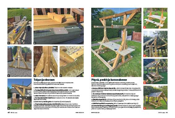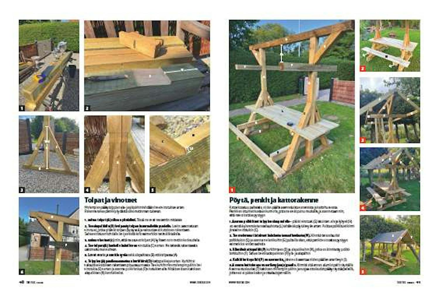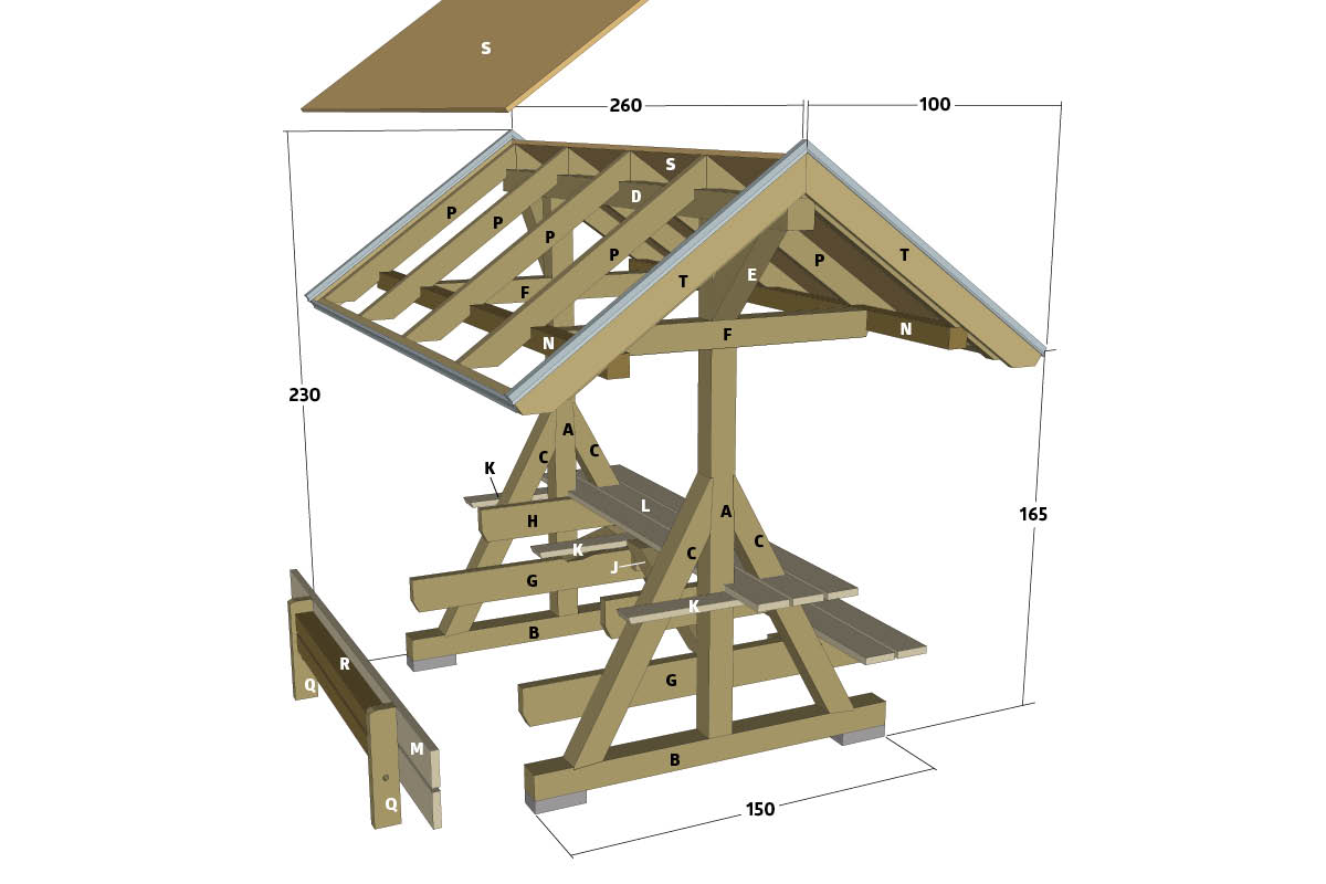 Katos koostuu palkeista, niiden päälle asennetuista vanereista ja kattohuovasta. Penkkien istuimet tuetaan kunnolla, jotta ne eivät painu mutkalle, ja asennetaan niin, että ne voi taittaa pystyyn.