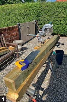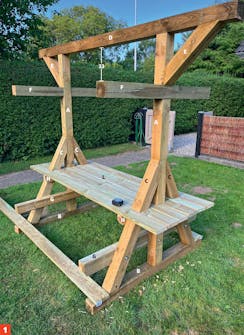 Molempien päätytolppien ala- ja yläpäihin tehdään lovet vinotukia varten. Rakenne tekee penkkipöydästä uskomattoman tukevan.