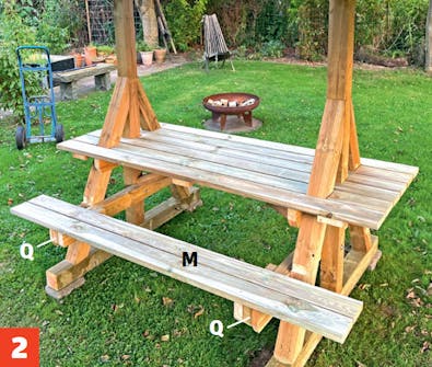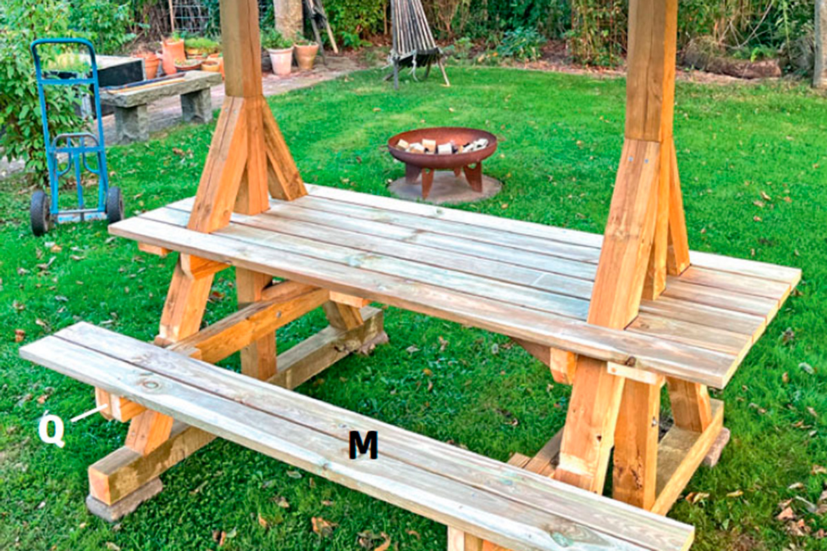 Tee molemmat istuimet kahdesta terassilaudasta (M). Kiinnitä terassilaudat poikki tukiin (Q) ja asenna ne lankkuihin (G) pulteilla siten, että penkit voi nostaa pystyyn esimerkiksi ennen sadetta.