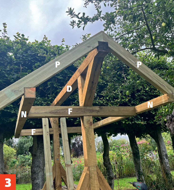 Kiinnitä kattopalkit (P) kurkihirteen (D) ja alapalkkeihin (N), jotka on kiinnitetty poikkilankkuihin (F). Sahaa lovet kattopalkkien (P) ylä- ja alapäihin.