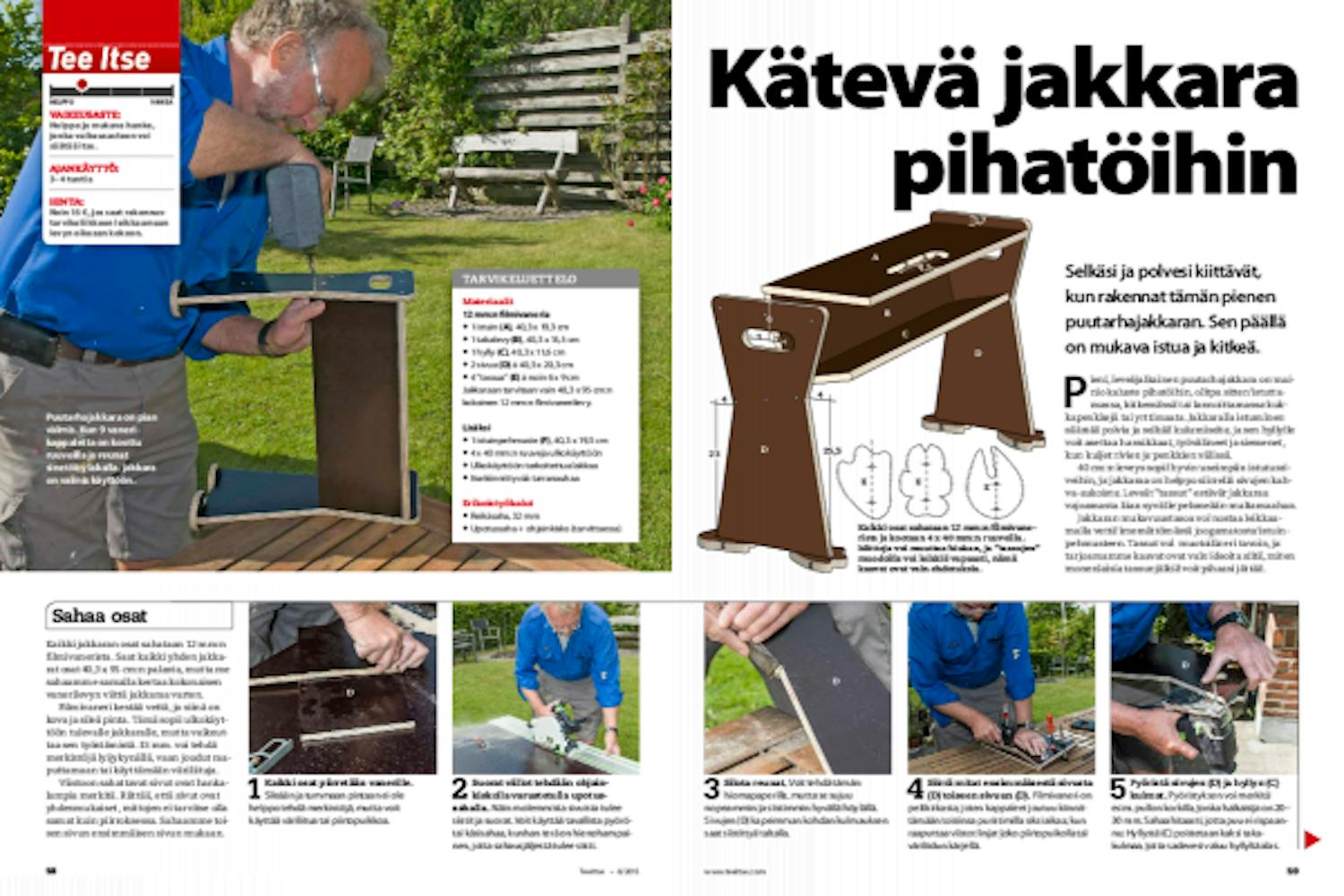 Kaikki jakkaran osat sahataan 12 mm:n filmivanerista. Saat kaikki yhden jakka-rat osat 40,3 x 95 cm:n palasta, mutta me sahaamme samalla kertaa kokonaisen vanerilevyn viittä jakkaraa varten.