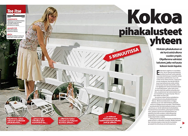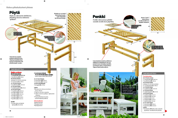 Nyt pääsemme käsiksi kaluston nerok-kaimpaan osaan. Nimittäin kaluston helppoon pakkaamiseen ja poissiirtä-miseen. Ratkaisu perustuu saranoiden ja siipimuttereiden käyttöön. Jokaisessa kalusteessa käytetään neljää 50 x 100 mm:n saranaa kalusteiden auki taittamiseksi. Lisäksi tarvitaan neljä 8 x 120 mm:n pulttia siipimuttereineen ja aluslevyineen. Niitä käytetään pöytä-levyn ja penkinistuimen kiinnittämi-sessä alustaan. Siipimuttereita käyttä-mällä vältymme työkalujen käytöltä, kun ryhdymme purkamaan kalusteita kasaan. Työstä selviää helposti vain muutamassa minuutissa.