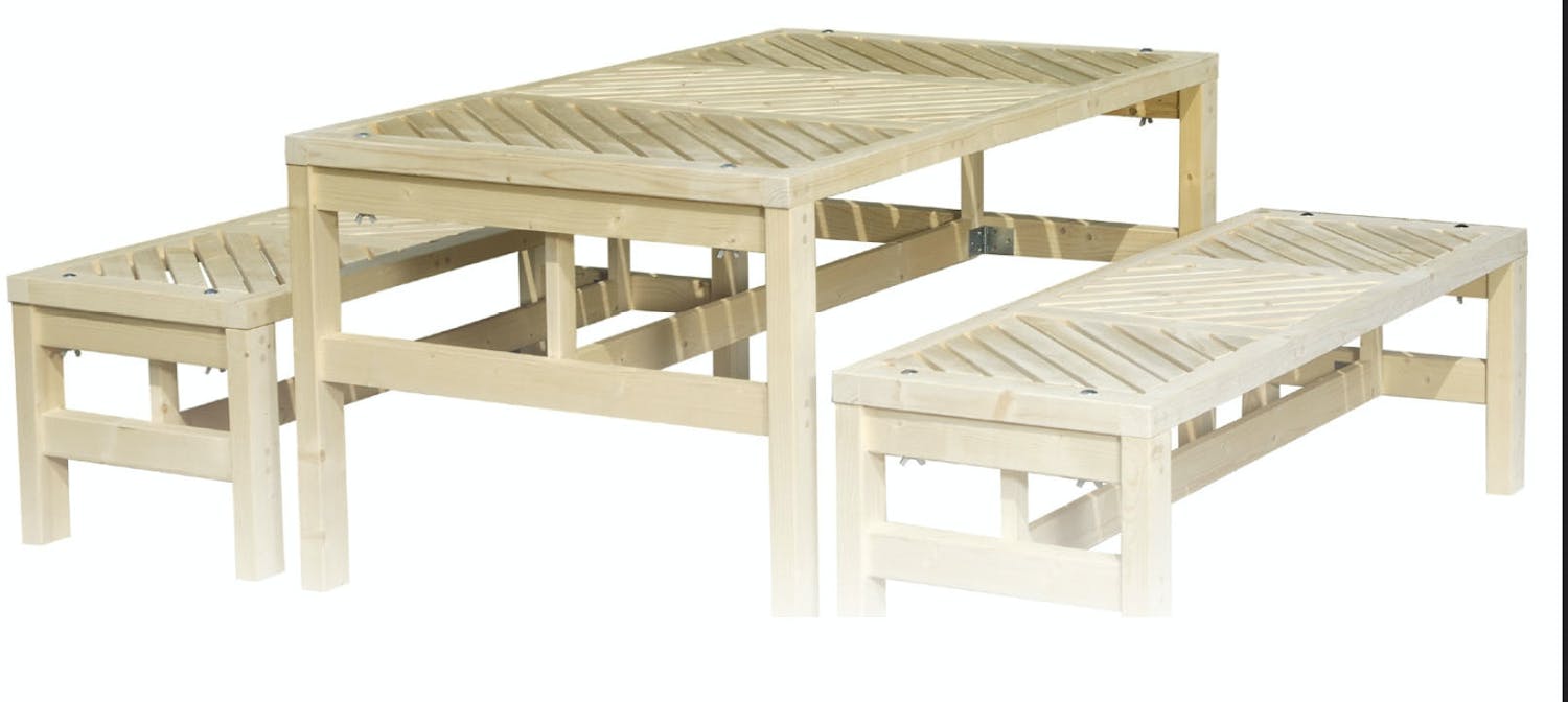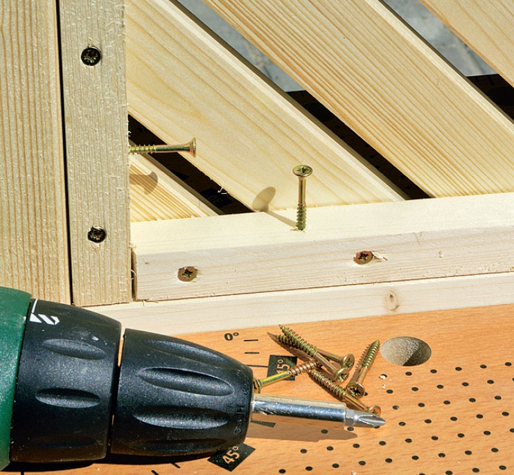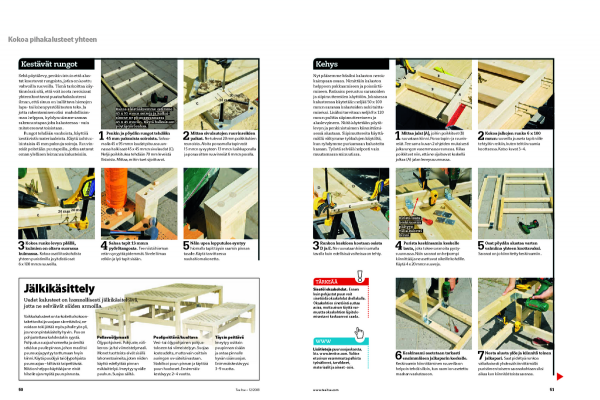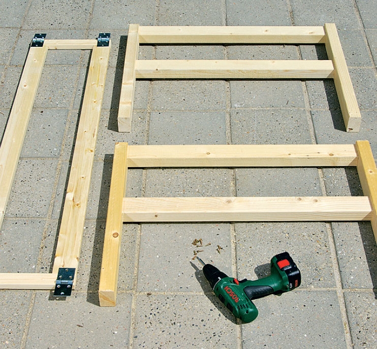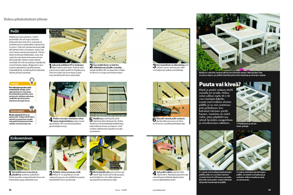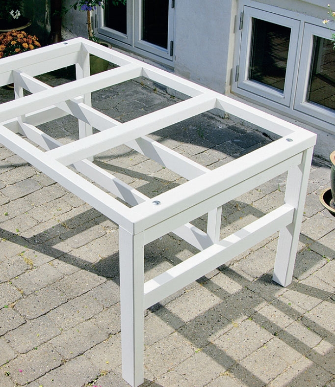 Sekä pöytälevy, penkin istuin että alus-tat koostuvat rungoista, jotka on koottu vahvoilla ruuveilla. Tämä tarkoittaa käy-tännössä sitä, että voit koota nerokkaat yhteenkoottavat puutarhakalusteesi ilman, että sinun on hallittava hienojen lapa- tai lohenpyrstöliitosten teko. Ja jotta rakentaminen olisi mahdollisim-man helppoa, hyödynnämme samaa rakennustapaa joka kalusteessa - vain mitat eroavat toisistaan.