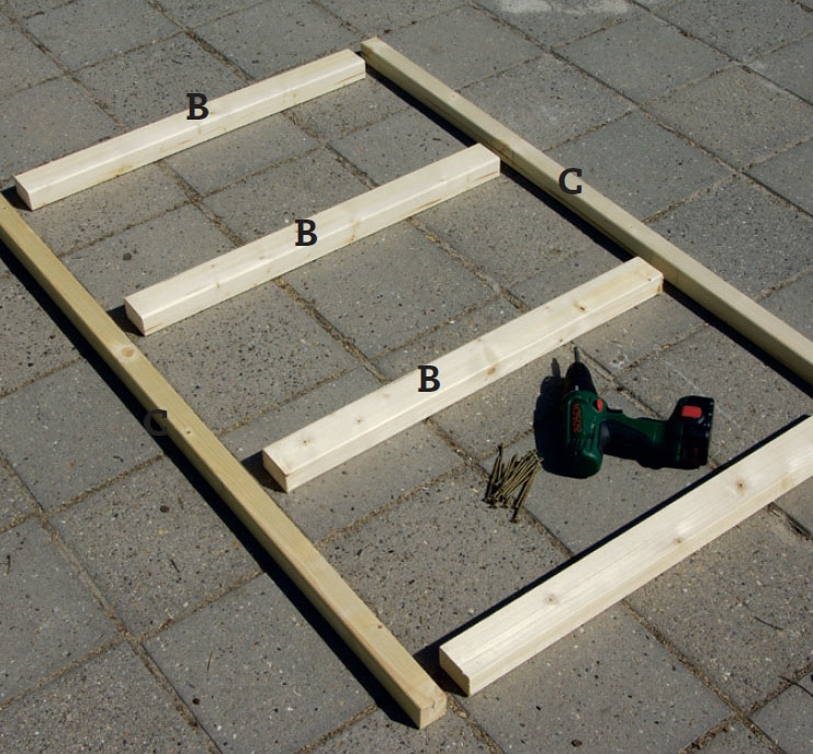 Penkin ja pöydän rungot tehdään 45 mm paksuista soiroista. Sahaa-malla 45 x 95 mm:n laudat pituusssuun-nassa halki saat 45 x 45 mm:n sivulaudat (C). Neljä poikkitukea tehdään 70 mm leveistä llistoista. Mittaa, mihin tuet sijoittuvat.