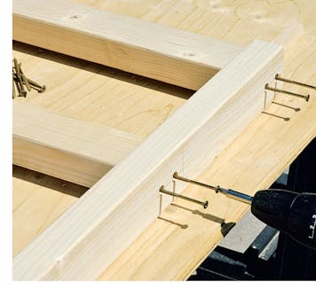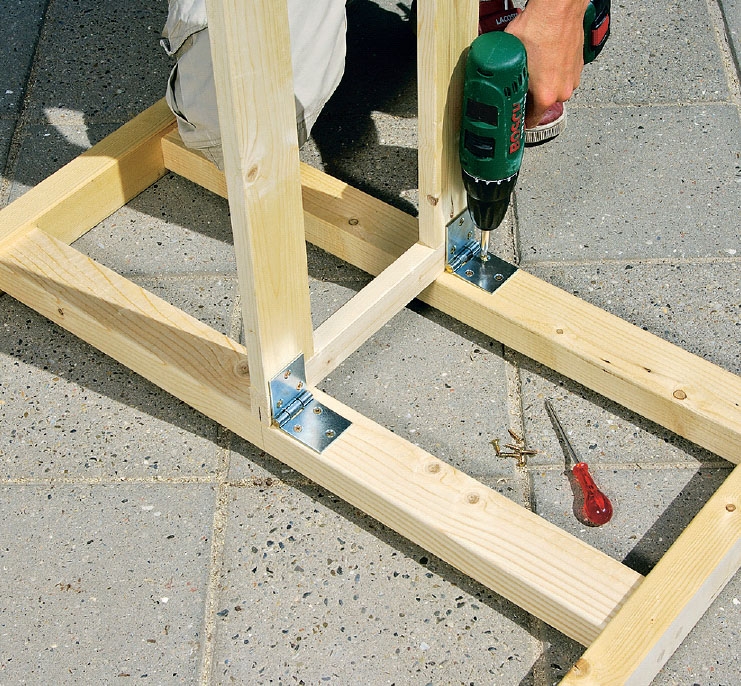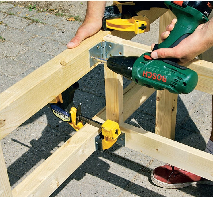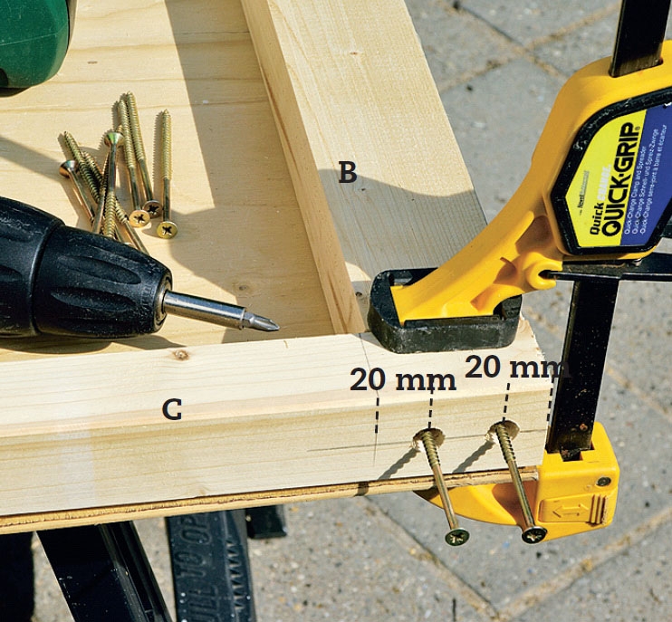 Kokoa runko levyn päällä, kulmien on oltava suorassa kulmassa. Kokoa osat liitoskohdista yhteen puristimilla ja yhdistä osat 6 x 100 mm:n ruuveilla.