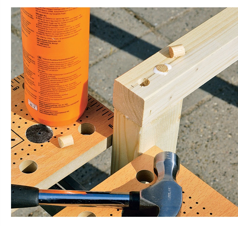 Sahaa tapit 13 mm:n pyörötangosta. Tee niistä hieman reiän syvyyttä pidemmät. Sivele liimaa reikiin ja lyö tapit sisään.