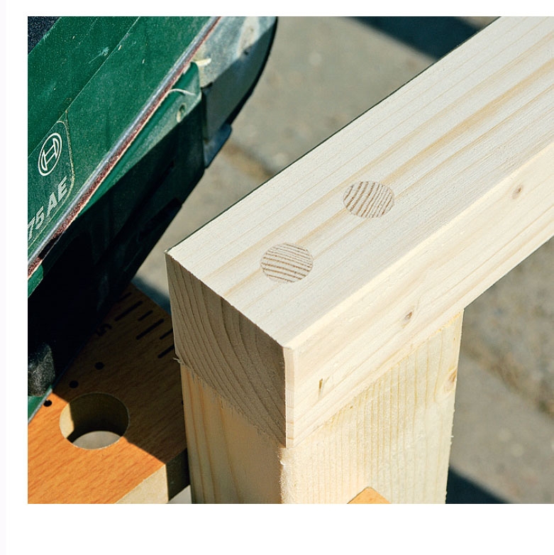 Mittaa sivulautojen ruuvinreikien paikat. Ne tulevat 20 mm poikkitukien reunoista. Aloita poraamalla tapinreät 15 mm:n syvyyteen 13 mm:n lusikkaporalla ja poraa sitten ruuvinreiät 6 mm:n poralla.