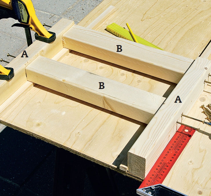 Mittaa jalat (A), joihin poikkituet (B) ruuvataan kiinni. Poraa tapin- ja ruuvin-reiät. Tee sama kuvan 2 ohjeiden mukaisesti jalkarungon vasemmassa reunassa. Kiilaa poikkituet niin, että ne sijaitsevat keskellä jalkaa (A) jalan leveyssuunnassa.