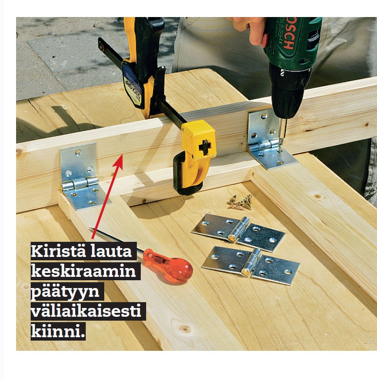 Purista keskiraamin keskelle lauta, joka tukee saranoita pysty-suunnassa. Näin saranat on helpompi kiinnittää ja ne asettuvat oikeille kohdille. Käytä 4 x 20 mm:n ruuveja.