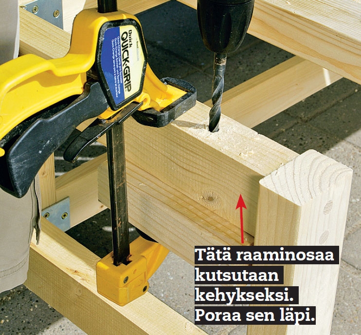 Siirrä pöytälevyä ja poraa kokonaan raamin läpi. Aseta raamin alle puupala puristimilla kiinni, niin vältät alapinnan repeytymiltä poratessasi sen läpi.