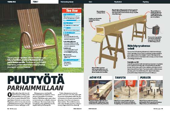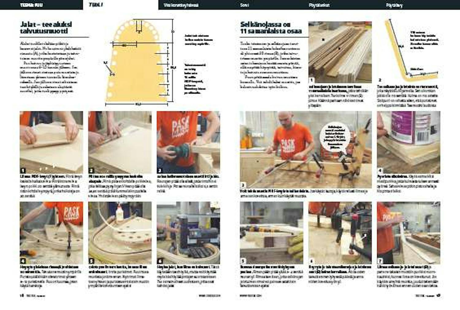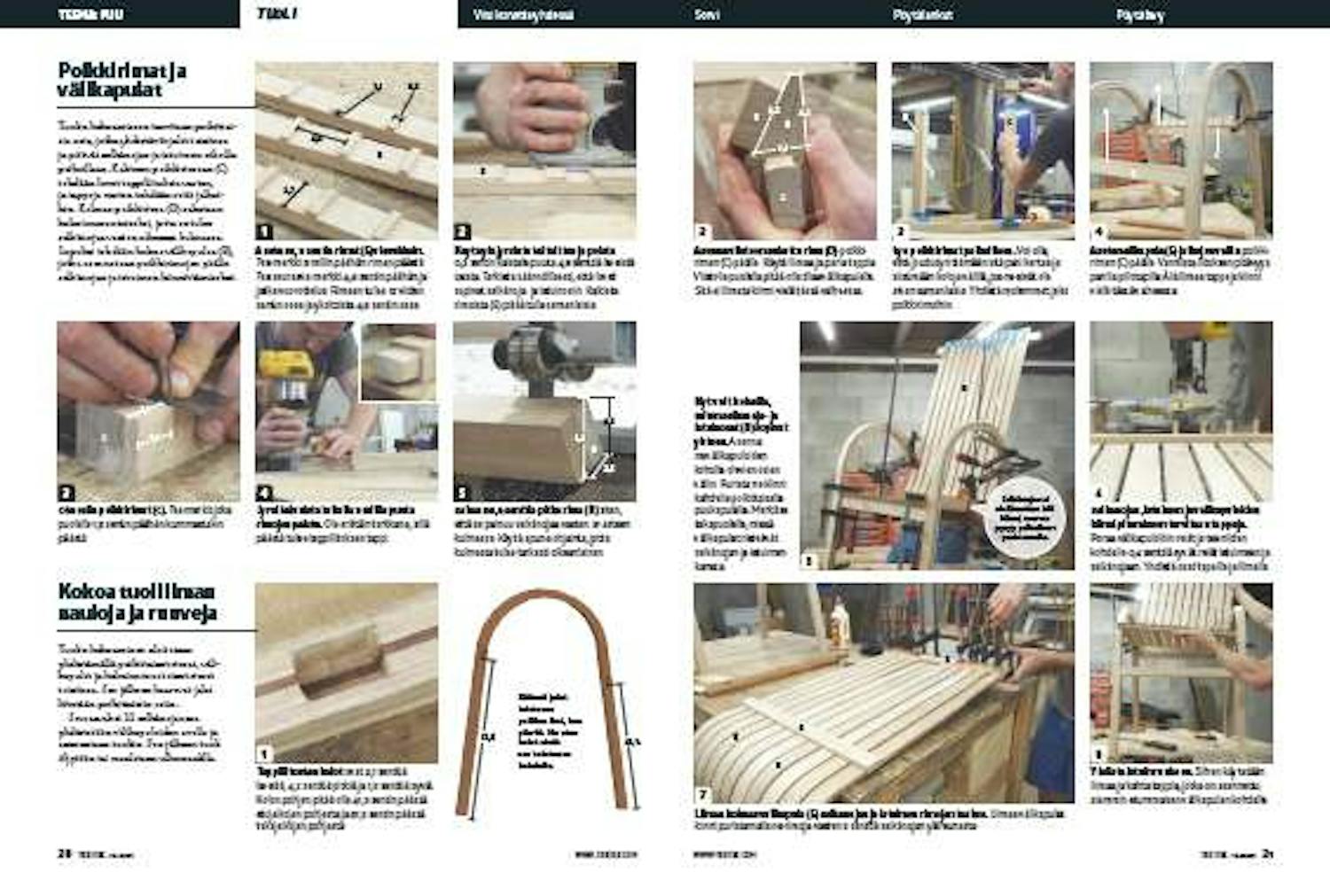 Selkänojan, istuimen ja välikapuloiden kiinni pitämiseen tarvitaan tappeja. Poraa välikapuloihin reiät ja tee niiden kohdalle 0,4 senttiä syvät reiät istuimeen ja selkänojaan. Yhdistä osat tapeilla ja liimalla.