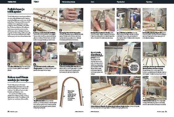 Seuraavaksi 11 selkänojaosaa yhdistetään välikapuloiden avulla ja asennetaan tuoliin. Sen jälkeen tuoli öljytään tai maalataan ulkomaalilla.