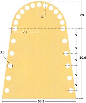 Liimaa MDF-levyt (F) yhteen. Piirrä levyn keskelle halkaisuviiva. Piirrä toinen viiva levyn poikki 20 senttiä yläreunasta. Piirrä ristin kohdalle ympyrä, jonka halkaisija on 20 senttiä.