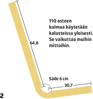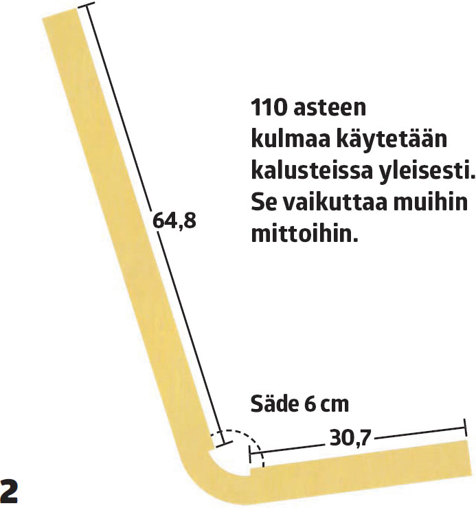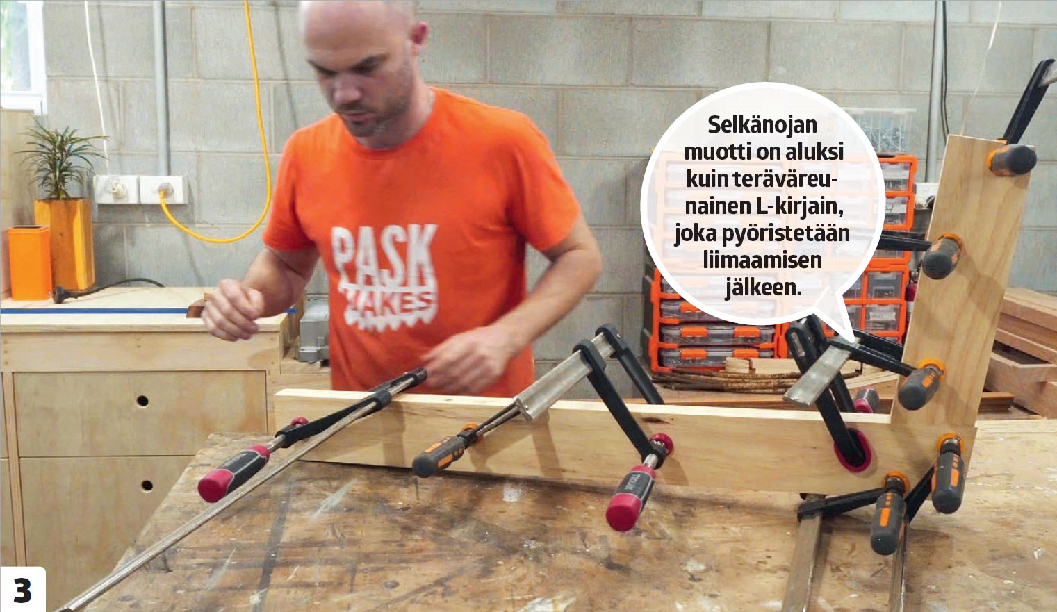 Tee selkänojaa ja istuinta varten muotti, joka näyttää L-kirjaimelta. Sen ulkomitan pitää olla 110 senttiä. Kulma on 110 astetta. Sisäpuoli on sahattu siten, että puristimet on helppo kiinnittää. Tee muotti laudoista.