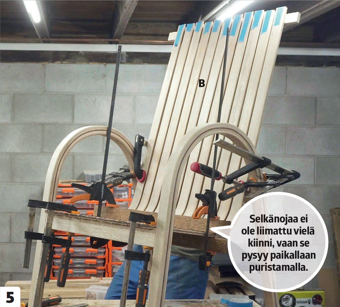 Tuolin istuimeen ja selkänojaan tarvitaan 11 samanlaista kolmikerrosrimaa eli yhteensä 33 rimaa (B), jotka taivutetaan muotin ympärille. Samanlaisten osien tekeminen kestää monta päivää, sillä ne pitää höyryttää, taivuttaa, liimata ja kuivata samassa muotissa.