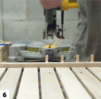 Käytä yläjyrsintä tai talttaa ja poista 0,3 sentin kaistale puuta 4,8 senttiä leveistä osista. Tarkista säännöllisesti, että lovet sopivat selkänoja- ja istuinosiin. Kaikista rimoista (E) pitää tulla samanlaisia.