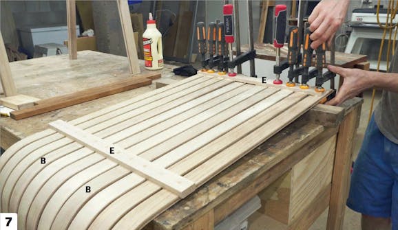 Liimaa kolmas välikapula (E) selkänojan ja istuimen rimojen taakse. Liimaa välikapulat kiinni puristamalla ne rimoja vasten 5 senttiä selkänojan yläreunasta.