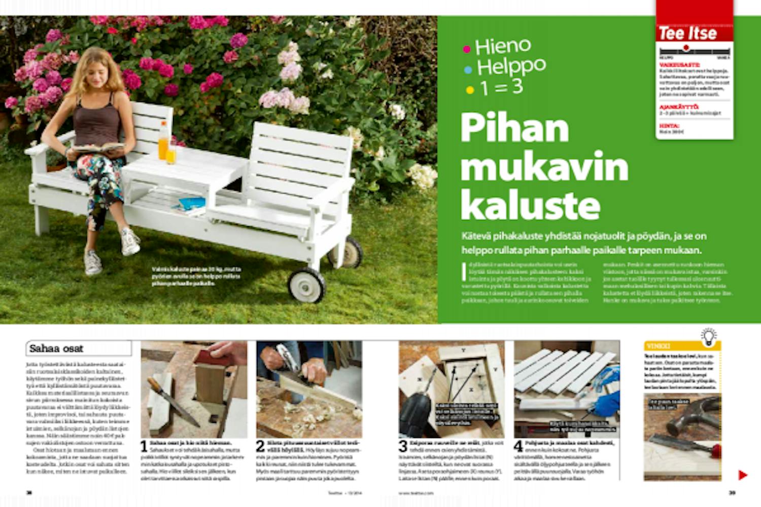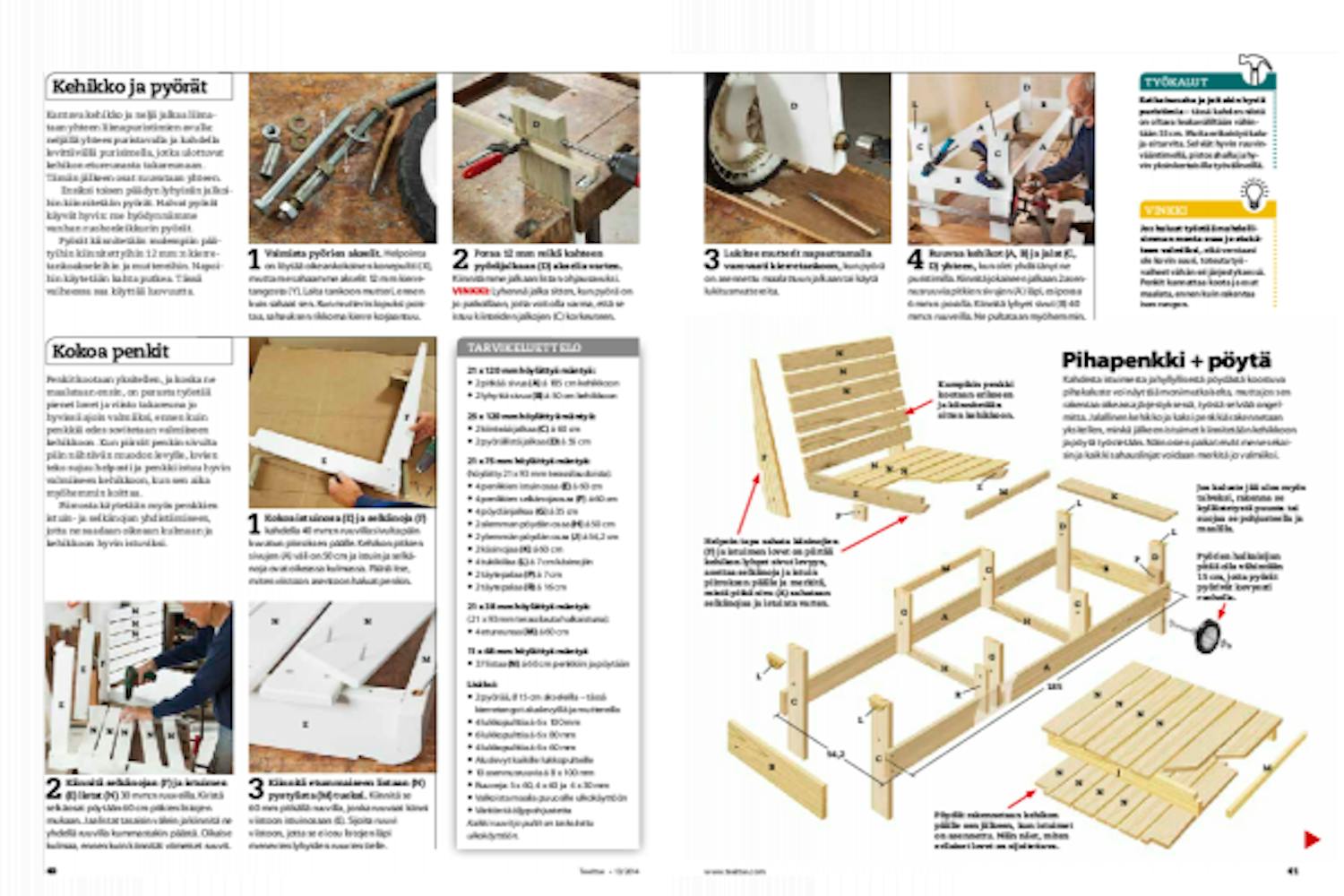 Jotta työstettävästä kalusteesta saataisiin ruotsalaisklassikoiden kaltainen, käytämme työhön sekä painekyllästet-tyä että kyllästämätöntä puutavaraa. Kaikkea materiaalilistassa ja seuraavan sivun piirroksessa mainitun kokoista puutavaraa ei välttämättä löydy liikkeist ä, joten improvisoi, tai sahauta puutavara valmiiksi liikkeessä, kuten teimme istuimien, selkänojan ja pöydän listojen kanssa. Näin säästimme noin 40 € pak-sujen vakiolistojen ostoon verrattuna.