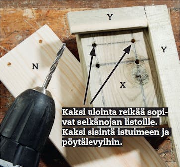 Istuimet asetetaan kehikkoon niin, että ne lepäävät kahden loven päällä. Istuimet kiristetään kehikon jalkoja vasten liimapuristimilla, jotta pulteille voidaan esiporata reiät 8 mm poralla ilman, että istuimet pääsevät liikkumaan.