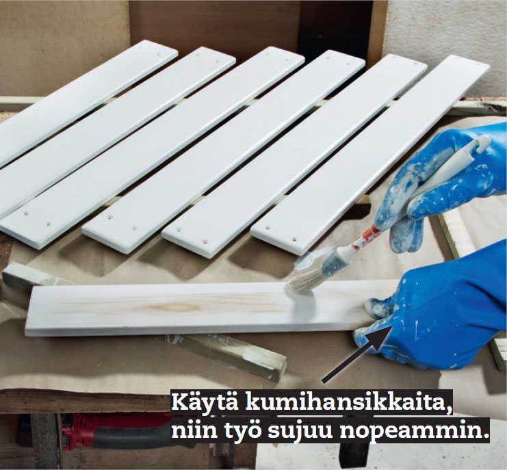 Osat hiotaan ja maalataan ennen ko koa mista, jotta ne saadaan suojattua kosteudelta. Jotkin osat voi sahata sitten kun näkee, miten ne istuvat paikalleen.