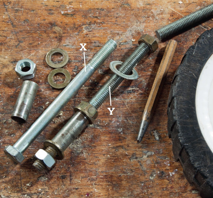 Valmista pyörien akselit. Helpointa on löytää oikeankokoinen konepultti (X), mutta me sahaamme akselit 12 mm kierre-tangosta (Y). Laita tankoon mutteri, ennen kuin sahaat sen. Kun mutterin lopuksi poistaa, sahauksen rikkoma kierre korjaantuu.