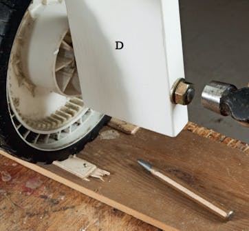 Poraa 12 mm reikä kahteen pyörä jalkaan (D) akselia varten. Kiinnitämme jalkaan listan ohjausavuksi.