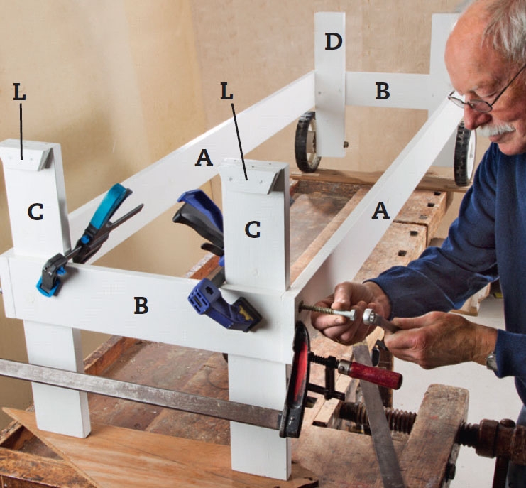 Ensiksi toisen päädyn lyhyisiin jalkoi-hin kiinnitetään pyörät. Halvat pyörät käyvät hyvin: me hyödynnämme vanhan ruohonleikkurin pyörät.
