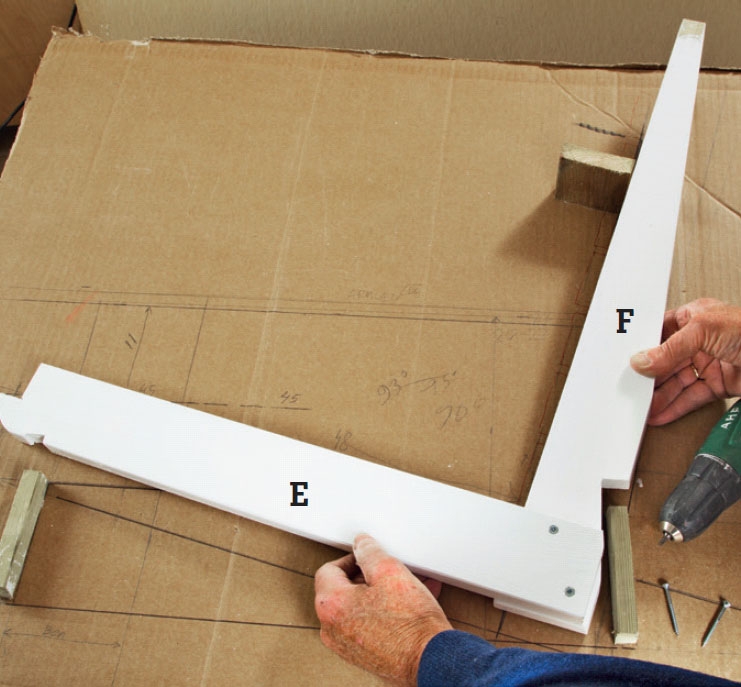 Penkit kootaan yksitellen, ja koska ne maalataan ensin, on parasta työstää pienet lovet ja viisto takareuna jo hyvissä ajoin valmiiksi, ennen kuin penkkiä edes sovitetaan valmiiseen kehikkoon. Kun piirrät penkin sivulta päin nähtä vän muodon levylle, lovien teko sujuu helposti ja penkki istuu hyvin valmiiseen kehikkoon, kun sen aika myöhemmin koittaa.
