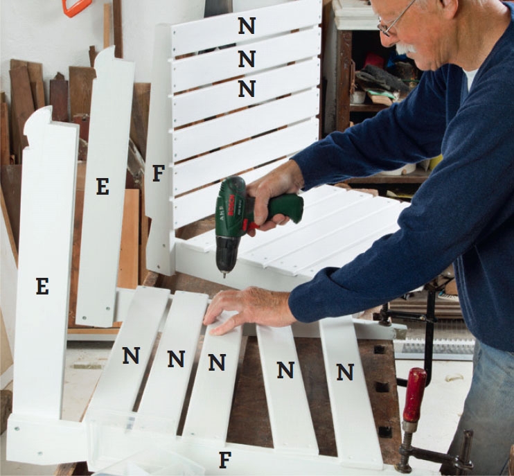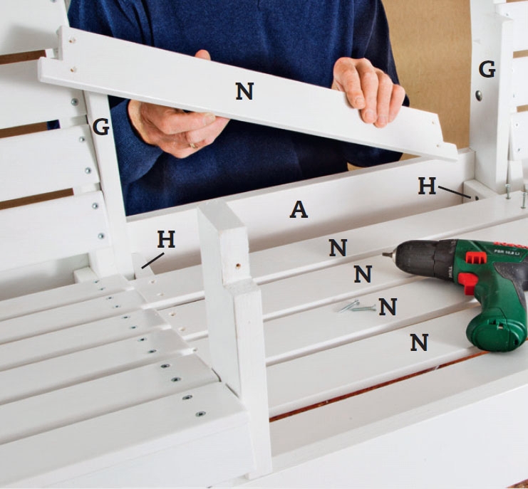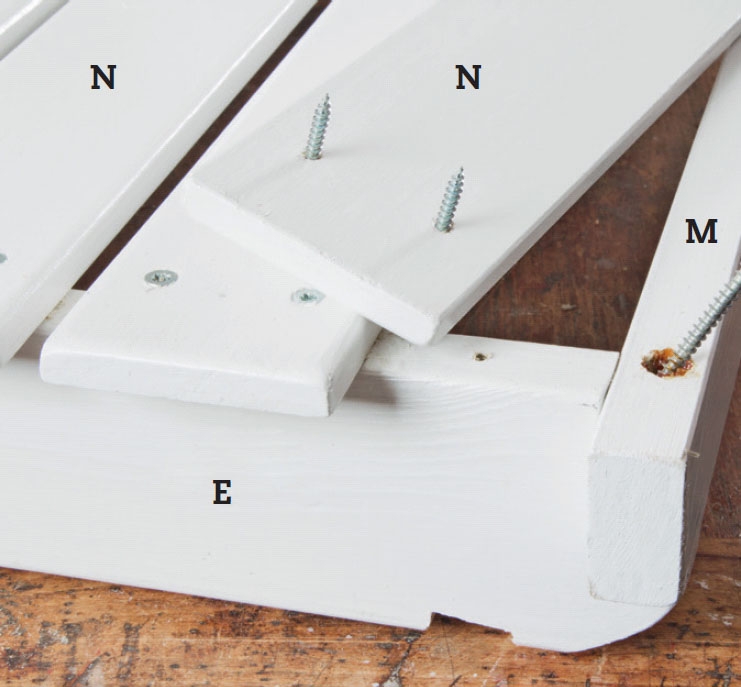 Kiinnitä selkänojan (F) ja istuimen (E) listat (N) 30 mm:n ruuveilla. Kiristä selkäosat pöytään 60 cm pitkien listojen mukaan. Jaa listat tasaisin välein ja kiinnitä ne yhdellä ruuvilla kummastakin päästä. Oikaise kulmaa, ennen kuin kiinnität viimeiset ruuvit.