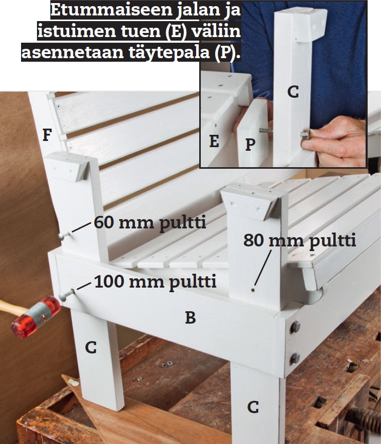 Jotta penkit kestäisivät mahdollisim-man pitkään myös säiden vaihdellessa ja vuosikausien kuormituksessa, istuimet pultataan kiinni molemmista päistä. Käytämme kolmen pituisia pultteja: 100, 80 ja 60 mm, sillä niiden täytyy yltää kahden, kolmen tai neljän 21 tai 25 mm paksun lautakerroksen läpi.