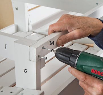 Rakenna alin hylly. Ruuvaa ensin kaksi istuinosaa (H) pöydänjalkoihin (G) kiinni 4 x 40 mm:n ruuveilla. Jaa sen jälkeen listat (N) tasaisesti ja ruuvaa ne istuimeen (H) kiinni. Uloimpiin listoihin sahataan lovi, jotta ne sopivat jalkojen ympärille.