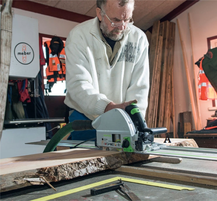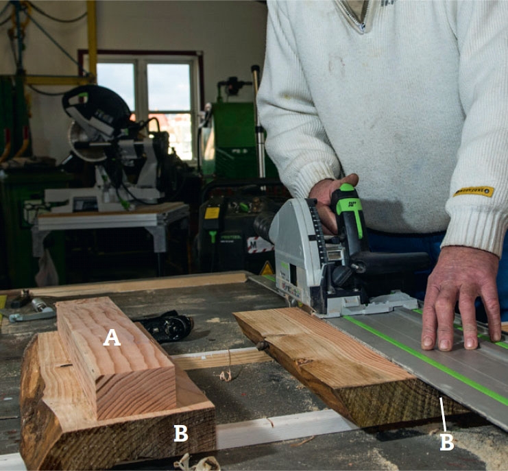 Sahaa jalat (A ja B) 8 cm levyisiksi lankuiksi. Koska lankuista on poistettu pehmeä pintapuu kaarnapinnan ympäriltä, jalat ovat lähes kokonaan ydinpuuta. Se säilyttää muotonsa ja kestää kosteutta paljon paremmin kuin pintapuu.