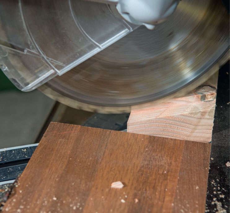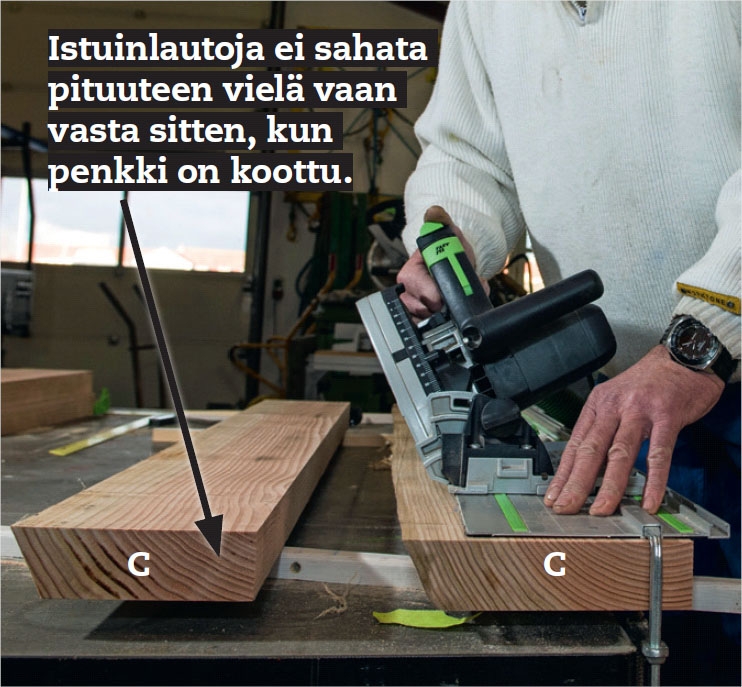 Sahaa istuinlautojen (C) päät viistoon, kun liima on kovettunut. Sahaa ensin upotussahalla samaan kul-maan kuin pitkät sivut. Teippaa reunan ym-päriltä, jottei puu rispaannu. Sahaa hitaasti, sillä terän täytyy työntyä koko laudan läpi.