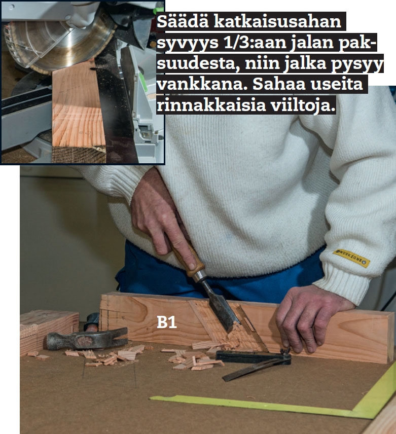 Nyt lautojen alapintaan sahataan istuinta varten lovet, joihin jalkojen tapit työntyvät. Jalat on sovitettava oman lan-kun paksuuden ja leveyden mukaan, joten näytämme nyt vain periaatteen.