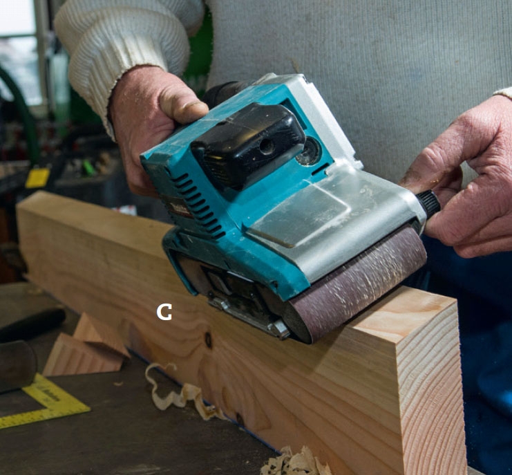 Hio istuinlaudat (C) sileiksi ja viistä ne. Nauhahiomakone on hyvä väline, sillä sahasta jää usein ura, joka voi yltää myös paksuun lankkuun. Teemme huulloksenkin höylällä, mutta viisteen voi työstää myös hiomakoneella tai yläjyrsimellä.