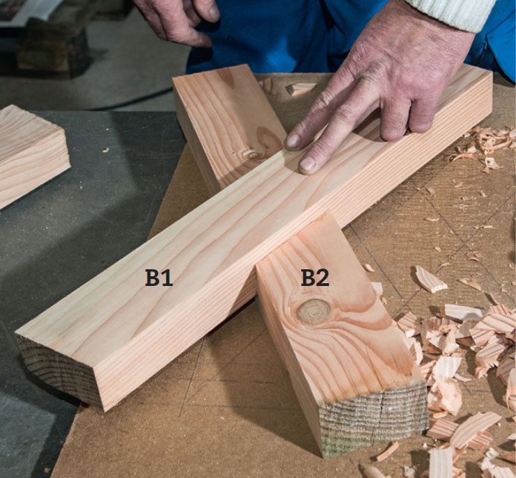 Nyt kokoamme jalat ristiin. Tähän käy-tetään yksinkertaista liitosta, jossa yksit-täiset jalat upotetaan toisiinsa ja ne pysyvät yhdessä tavallisella kaluste-ruuvilla - kaksiosaisella ruuvilla, jossa on kanta molemmissa päissä eli pultilla ja mutterilla.