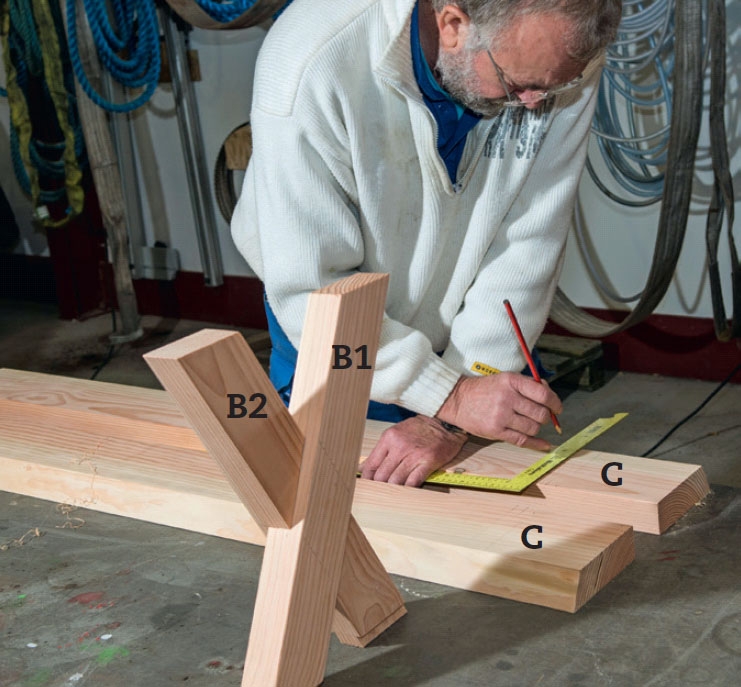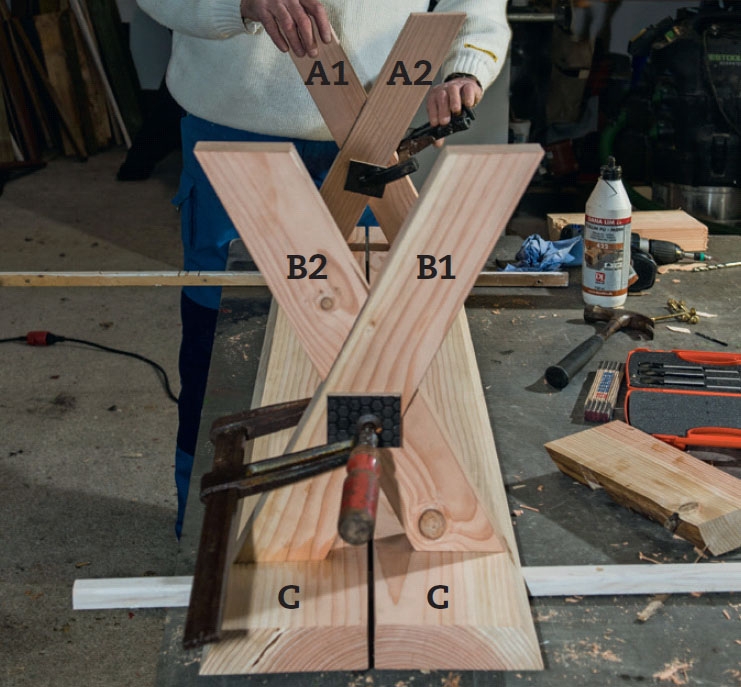 Merkitse istuinlautoihin (C) neljä uraa, joihin jalat (A ja B) työntyvät. Ensin piirrämme merkit niin, että asetamme istuinlaudat ja jalat oikeaan suhteeseen toisiinsa nähden, ja sen jälkeen oikaisemme merkinnät suorakulmaimen avulla.