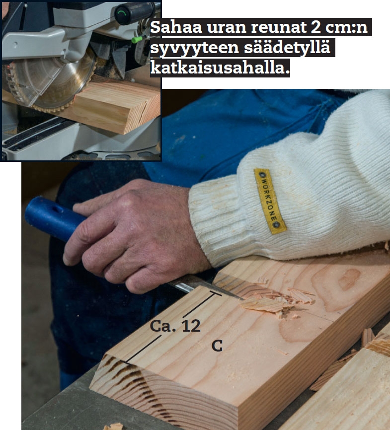 Sahaa lovea varten jalan sivuun viiilto ja talttaa se auki leveällä taltalla. Sahaa monta vierekkäistä viiltoa, niin talttaaminen sujuu helpommin. Talttaa ensin toisesta reunasta, sitten toisesta, niin saat reunoista siistit.