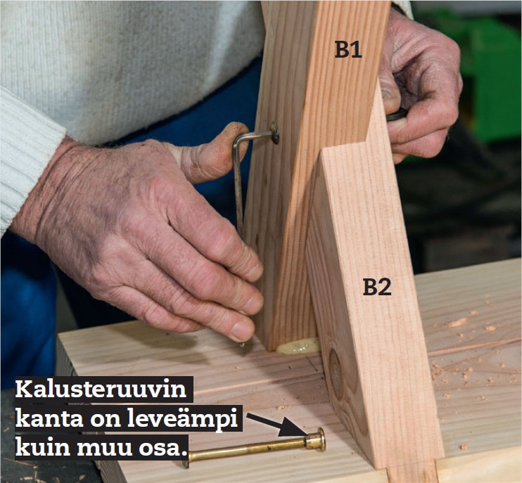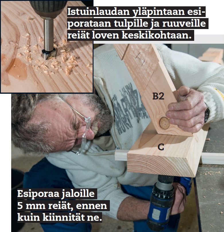 Liimaa ja ruuvaa jalat (A ja B) istuin-lautoihin yhdellä 6 x 120 mm ruuvilla jokaisesta liitoksesta. Koska ruuvien kannat ovat istuinlankun yläpinnassa, ne tulpataan. Poraa istuimen yläpintaan 10 mm syvyyteen 12 mm poralla ja sen jälkeen 6 mm poralla.