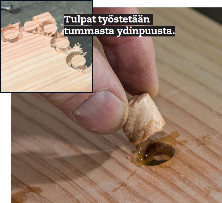 Peitä ruuvikohdat tulpilla. Poraa tulpat tulppaporalla puusta, josta sahasit isot lankut. Tulpat liimataan PU-liimalla niin, että vuosisyyt ovat laudan syiden suuntaiset. Kun liima on kovettu-nut, tulppa katkaistaan ja hiotaan tasoon.