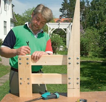 Jotta hanke olisi todella helppo, pen-kin rakenne on suorakulmainen. Selkä-nojan hyvä kaltevuus syntyy sahaamalla takajalkojen etureunat viistoon. Osat yhdistetään pulteilla ja muttereilla.