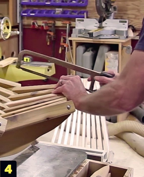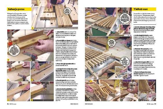 Halkaise leveä lauta ja sahaa rimat sopiviksi pätkiksi. Poraa seuraavaksi rimoihin reiät. Suurin osa rei’istä porataan riman keskelle kaksi senttiä päästä, joten poraamiseen kannattaa tehdä sapluuna tai muu stoppari, jotta jokaisen reiän paikkaa ei tarvitse mitata erikseen.