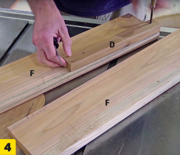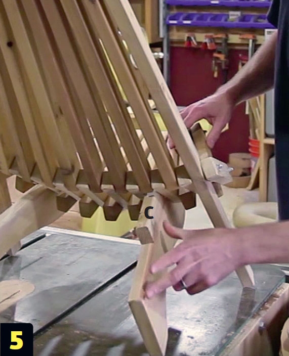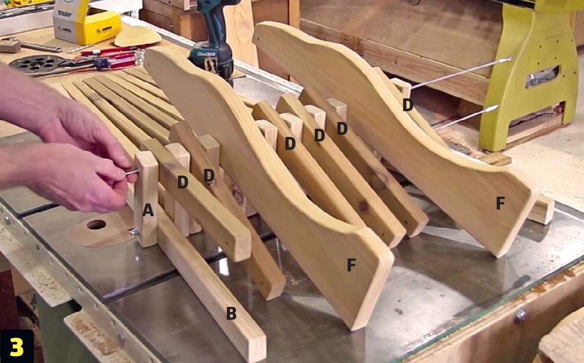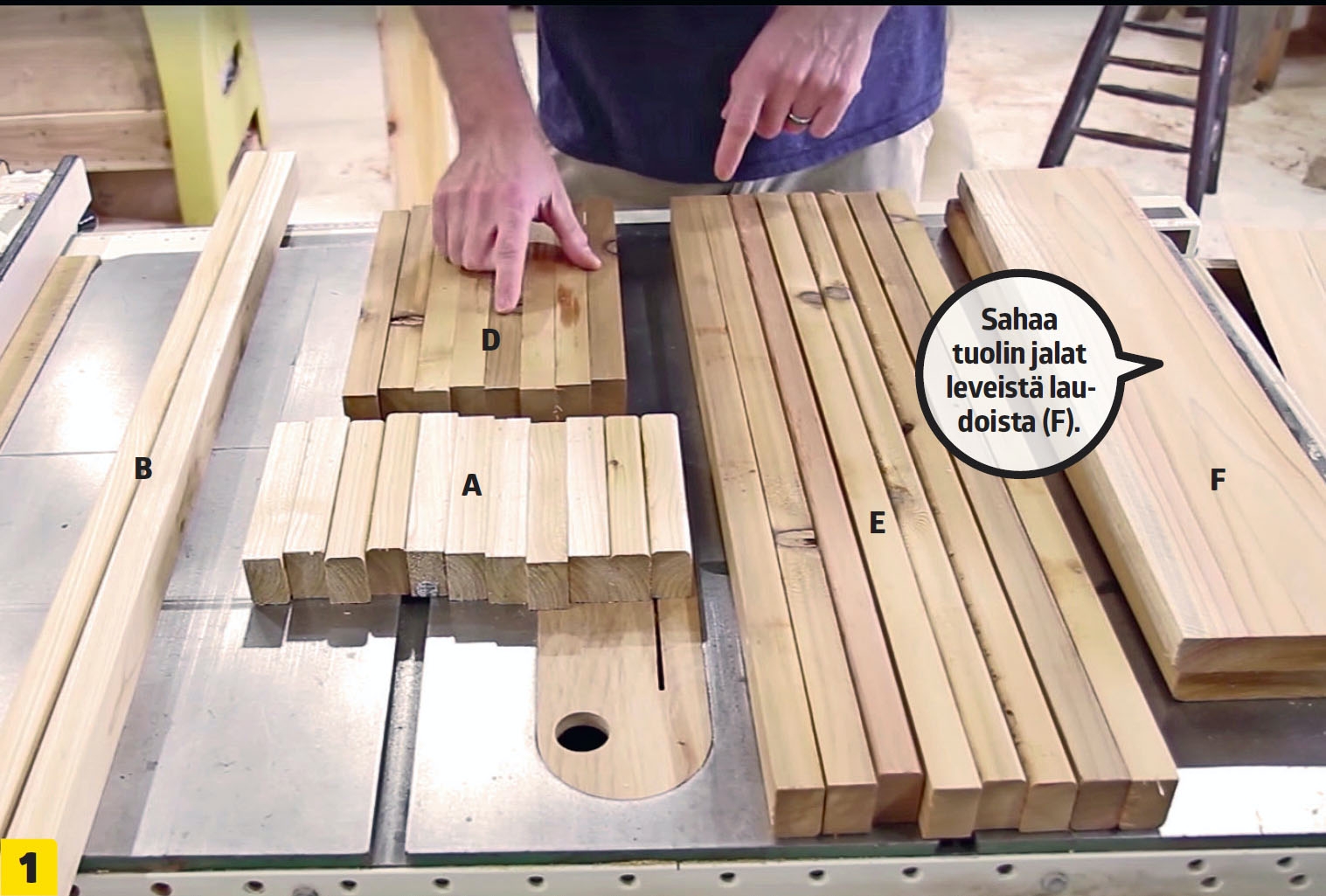 Sahaa kaikki osat A, B, C, D, E ja F. Tee osat (F) 120 milliä leveästä laudasta. Voit halutessasi tehdä myös tuolin takajalat samoista rimoista.