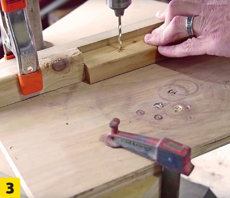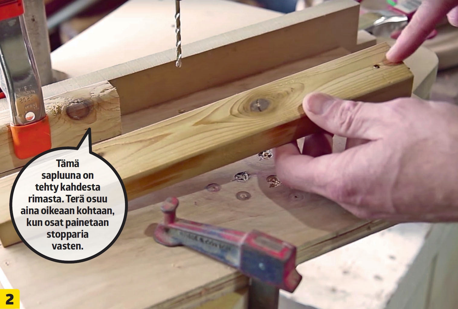Poraa kaikkiin 29 rimaan kaksi reikää. Suurin osa rei’istä porataan rimojen keskelle kaksi senttiä päästä, joten poraamista var-ten kannattaa tehdä väliaikainen sapluuna tai stoppari. Stoppari on helppo rakentaa parista rimanpätkästä puristimien avulla. Stopparin avulla työ sujuu nopeasti, kun rimat voi asettaa helposti oikeaan kohtaan eikä reikien paikkaa tarvitse mitata joka kerta erikseen. Voit käyttää E-rimaa sapluu-nana, kun poraat reikiä pitkiin B-rimoihin. Älä poraa vielä tässä vaiheessa reikiä lautoihin (F).